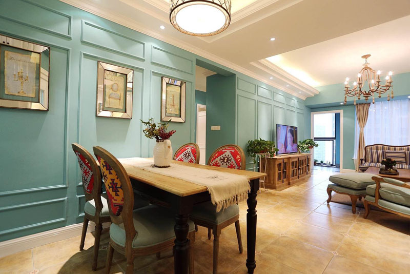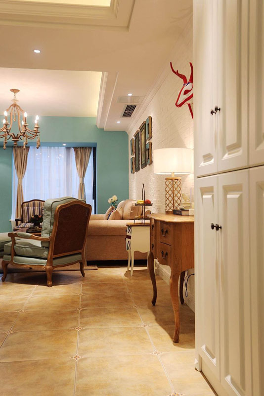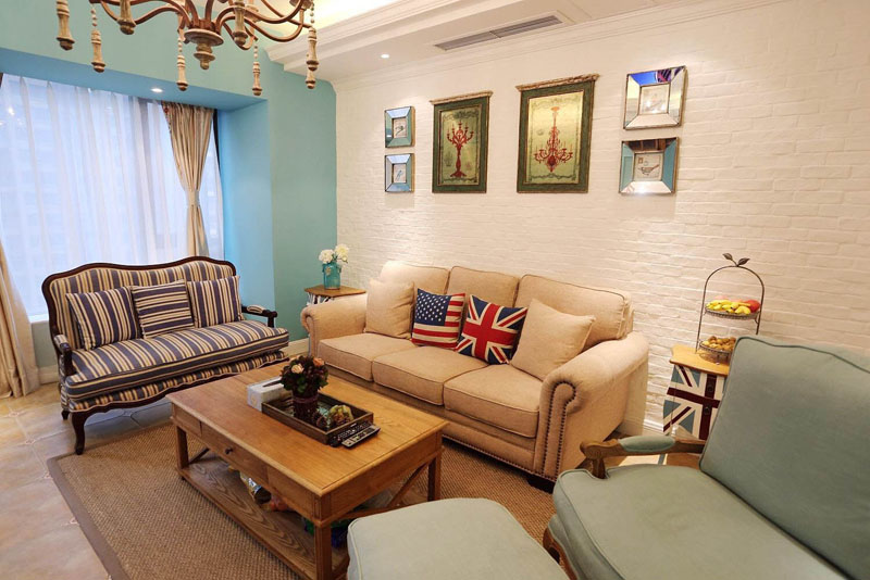客厅色彩明快,利用天然光配合室内冷暖光,青蓝色的电视背景墙设计和白色文化砖的沙发背景墙两色对比,显得整个颜色对比清新,舒适,辅光源的重点设计弥补主光源的不足,同时增加空间层次感。三色格调沙发,多样性的居住感受,时而温馨;时而稳重;时而惬意,普通的聊天都能趣味。